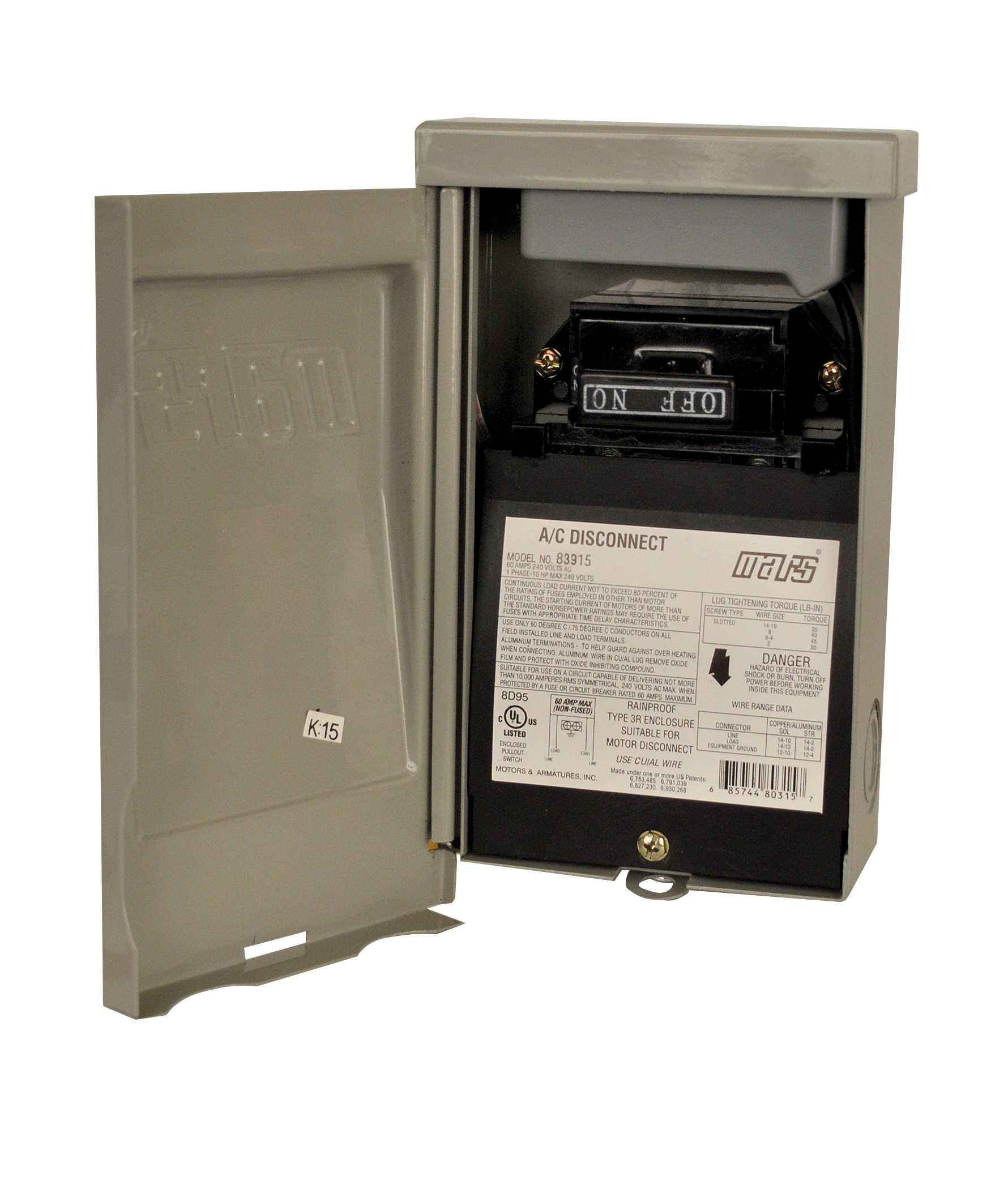 No. of Poles 2 Type Side Open A/C Disconnect Amp Rating 60 Amp Fused or Non-Fused Non-Fused Color Gray Voltage Rating 240 Width (in.) 8.66 Side or Top Open Side Enclosure Material CRS Anti-UV Powder Coated Steel Depth (in.) 5.12 Outlet - GFI No Phase Single Standards cULus approved for use in US and Canada NEMA Enclosure Rain proof, NEMA 3R Enclosure Height (in.) 2.25 NOTE Includes Surge Protector 83910