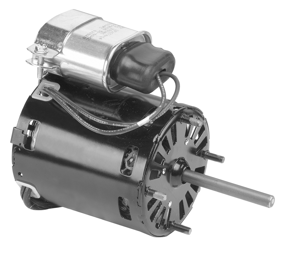 3.3" Diameter PSC Thermally Protected Open Air Over Class B Insulation, 40°C Ambient Sleeve Bearing 5/16" Diameter Shaft with Flat 13" Leads with Quick Connect Molded Plug Extended Studs Shaft End
